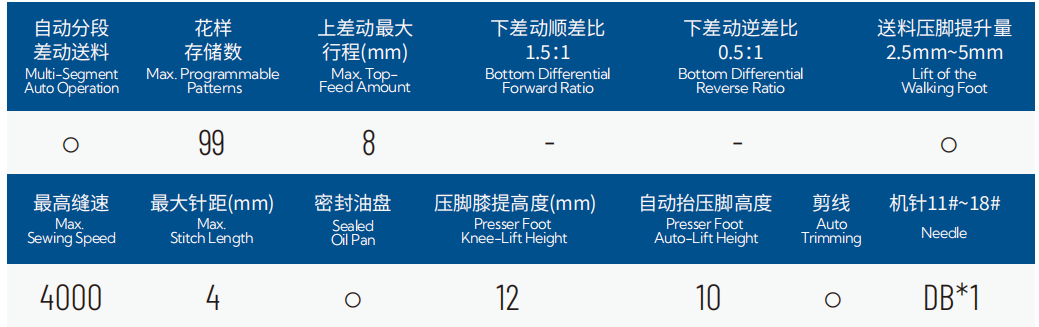 4.头部微油,全封闭油盘,气动抬压脚;