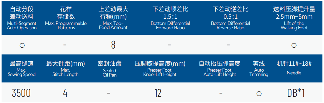 1.电子式上差动调节:支持多种差动量一键切换,最多可设置16段缝纫流程;
