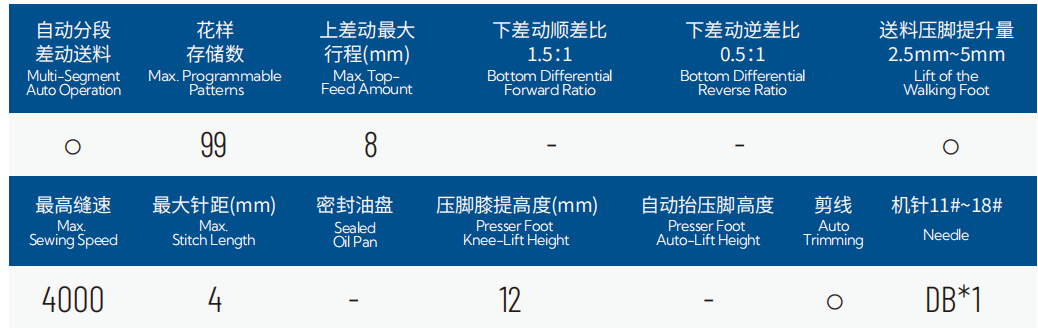 2.5/9/11段程序可选,每段差动与针数(最高999针)可调;