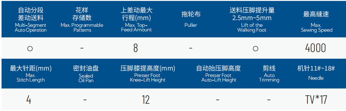 1.电子式上差动调节:支持多种差动量一键切换,最多可设置16段缝纫流程;