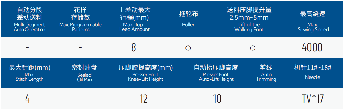 1.电子式上差动调节:支持多种差动量一键切换,最多可设置16段缝纫流程;